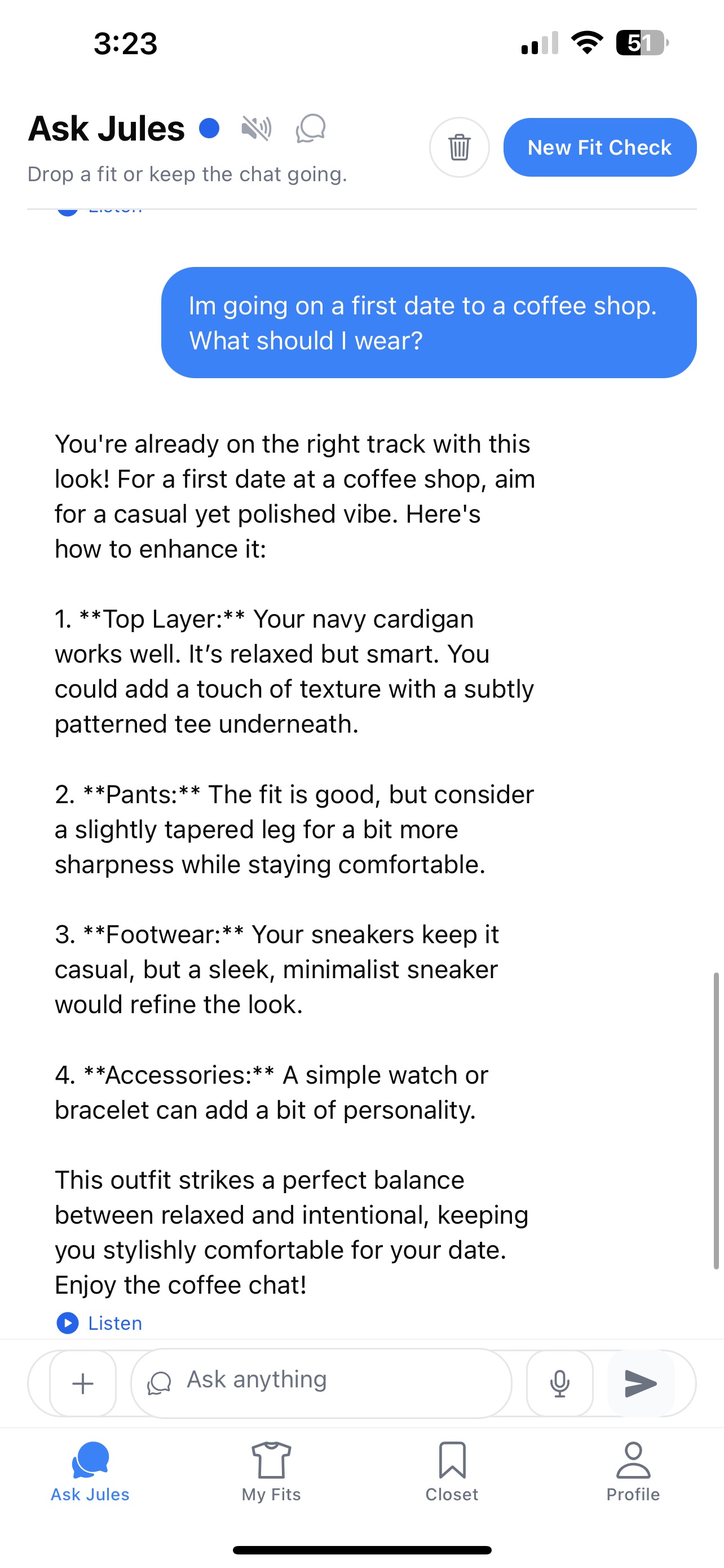Chat with Jules to talk through style decisions and outfit choices.